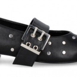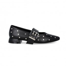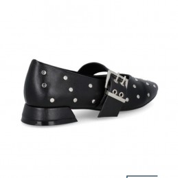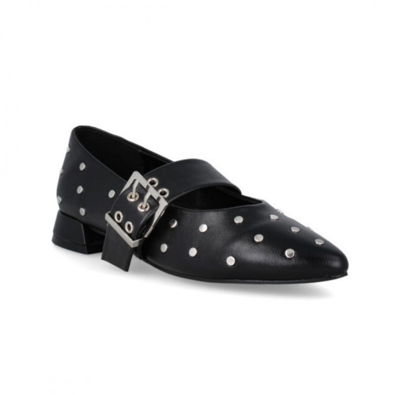 Bailarina de mujer de la marca D´Angela, fabricada en material imitación piel en color negro con tachuelas y detalle de hebilla para una mayor sujección.